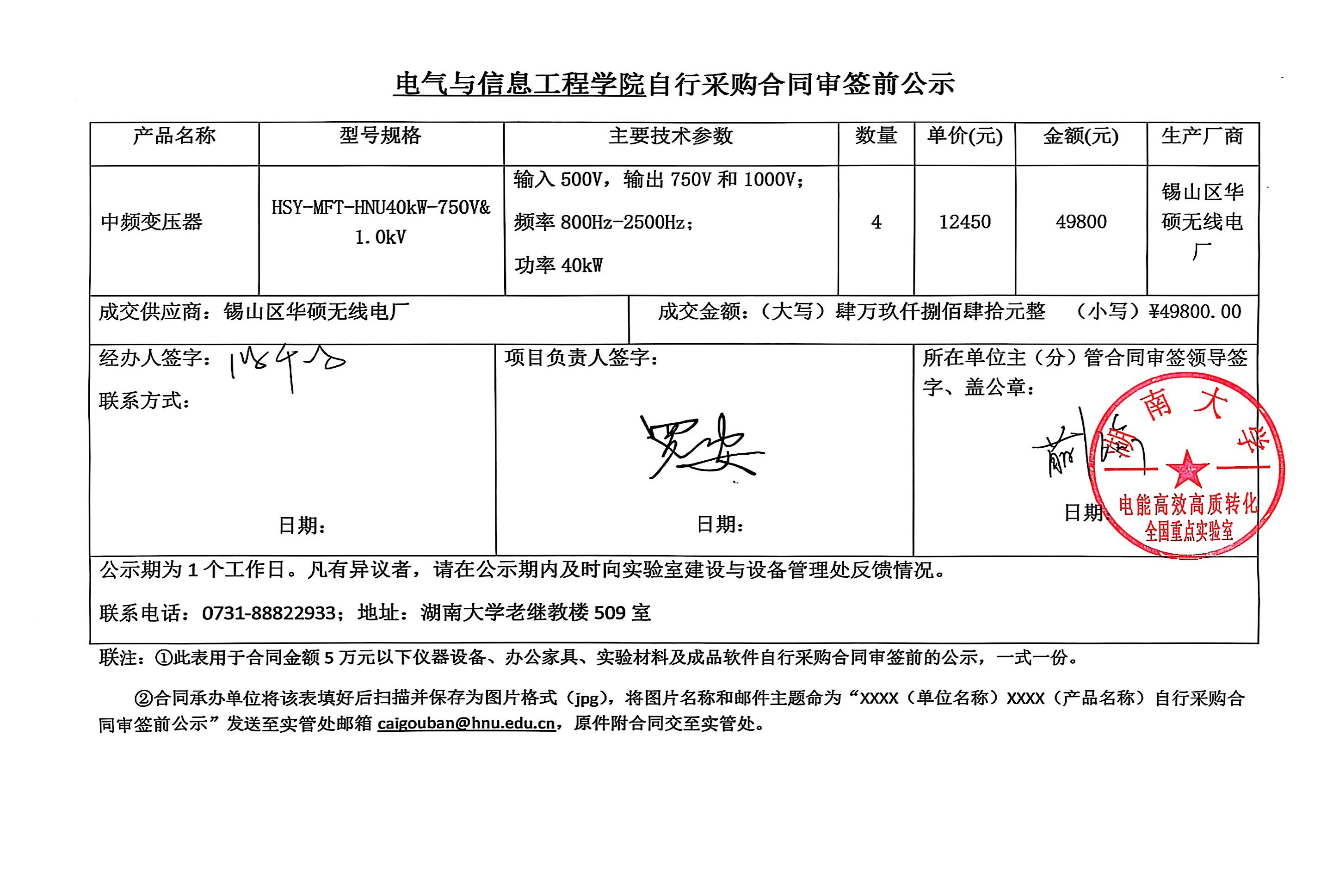 电能高效高质转化全国重点实验室中频变压器自行采购合同审签前公示