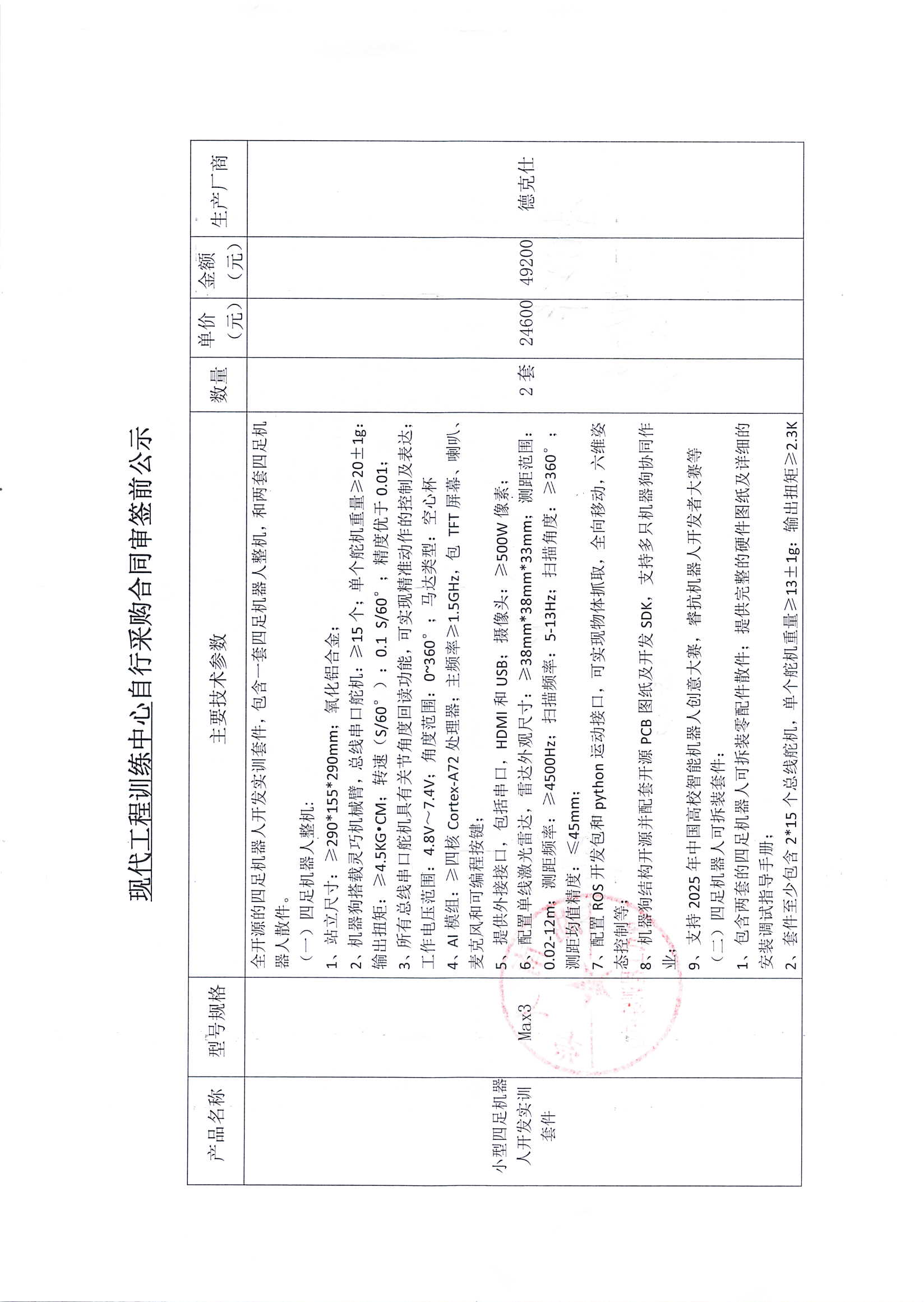 工训中心小型四足机器人开发实训套件自行采购合同审签前公示公示