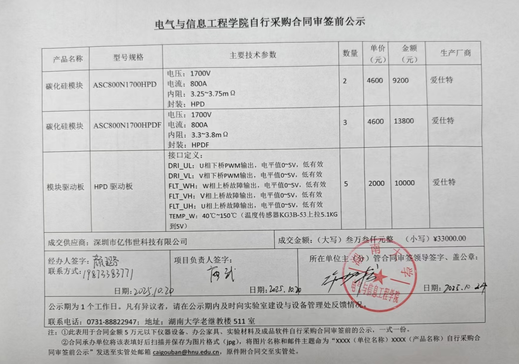 湖南大学电气与信息工程学院碳化硅模块自行采购合同审签前公示