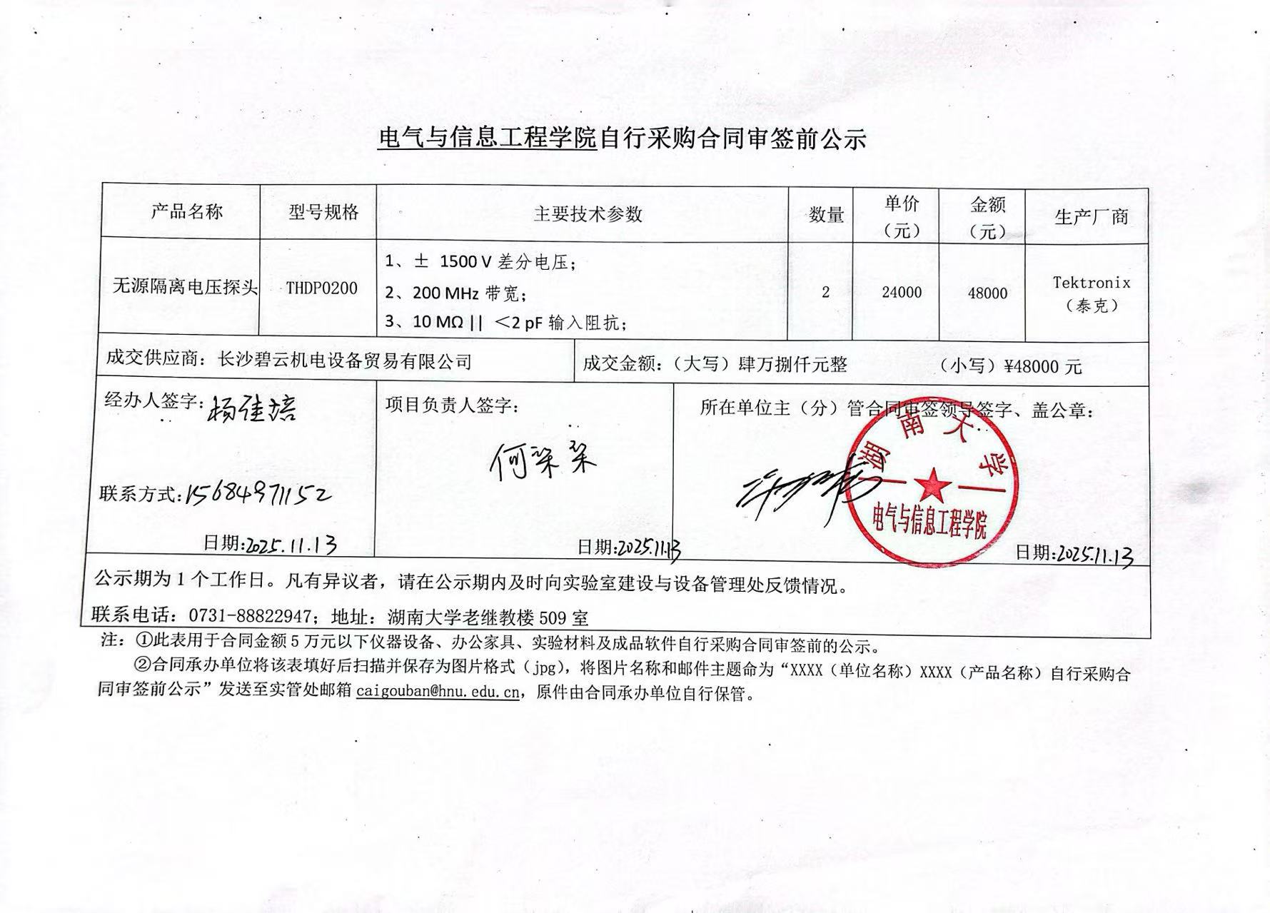 湖南大学电气与信息学院无源隔离电压探头自行采购合同审签前公示