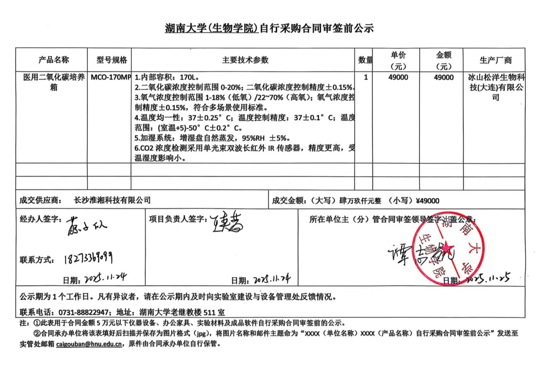 湖南大学生物学院医用二氧化碳培养箱自行采购合同审签前公示